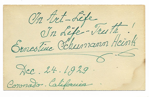 SCHUMANN-HEINK, Ernestine (1861-1936). Austrian born American contralo; known for her interpretations of Wagner and Strauss. A.Q.S. boldly signed and dated: “In Art-Life, In Truth! Ernestine Schumann Heink, Dec. 24,1929, Coronado, California.” A fabulous item that displays well......................................$77.50![]() |