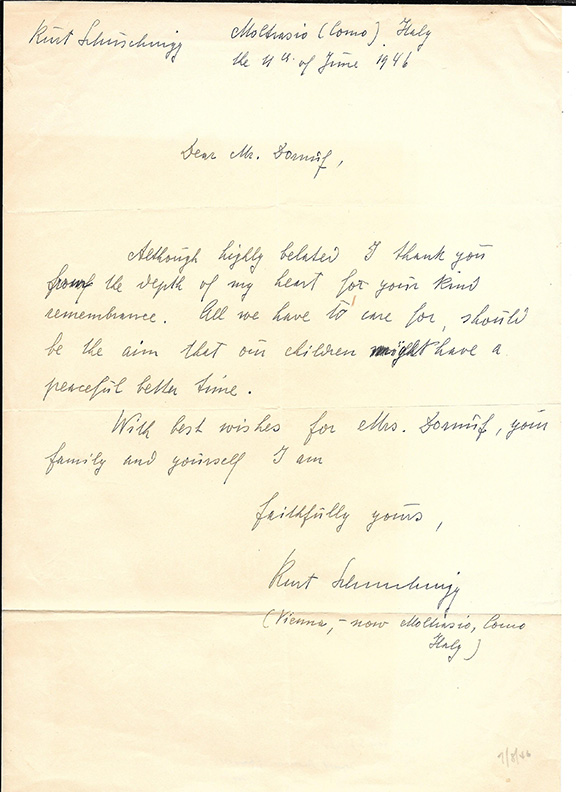 SCHUSCHNIGG, Kurt von (1897-1977). Statesman, founded and headed the Ostmarkische Sturmscharen. He was the Federal Chancellor from 1934. After the Nazi occupation of Austria, he was arrested and held in prison and in a concentration camp. He was liberated in 1945. Scarce autograph letter signed with two full signatures, one full page, Moltrasio, Italy, 11 June 1946. Interesting content: “Although highly belated I thank you from the depth of my heart for your kind remembrance. All we have to care for should be the aim that our children might have a peaceful better time...” A fine letter not long after leaving Nazi prison........................ $225.00