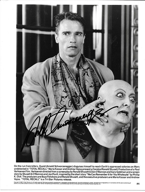 SCHWARZENEGGER, Arnold (1947- ) Popular actor in many films. Governor of California (2 terms). Mr. Universe at the age of 20. Author. Tri-Star Pictures (1990) publicity photograph of Schwarzenegger on the run from killers disguises himself to reach Earth’s colonies on Mars. Very boldly signed in full. Genuine signed photographs of Schwarzenegger have become rather uncommon. This is a wonderful vintage example..............................................SOLD |