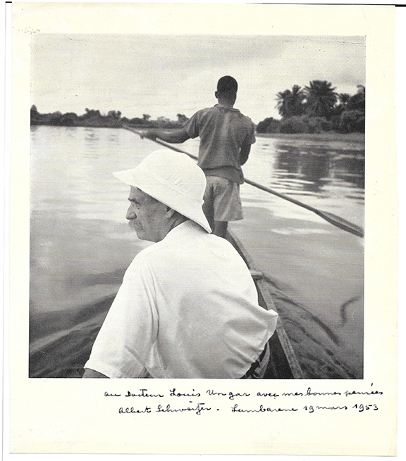SCHWEITZER, Albert (1875-1965). French Protestant Clergyman, philosopher and physician; awarded the Nobel Peace Prize (1952). Founder of the Lambarene Hospital in French Equatorial Africa (1913). Attractive printed photograph of Dr. Schweitzer sitting in a native canoe paddled down a river by an African native. Overall size 8”x9.25” with image area measuring 7”x7”. Inscribed, signed and dated on the lower white margin in French to another doctor. Some research tells us this doctor was Schweitzer’s dentist. Schweitzer is somewhat uncommon in signed portraits and this is a stunning example............ $850.00