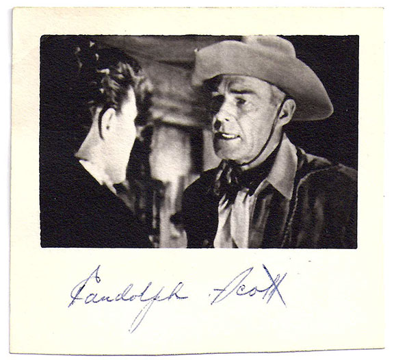 SCOTT, Randolph (1898-1987). American film actor, leading man for most of his long career. Appeared in war, horror and fantasy films. Best remembered for his endearing image as a Western hero. He made over 100 film appearances. Photograph, B&W, measures appx: 3.5”x3.5”, head & shoulders pose dressed as a cowboy. Signed on the lower white margin. Un-inscribed photos of Scott are uncommon................$85.00 |