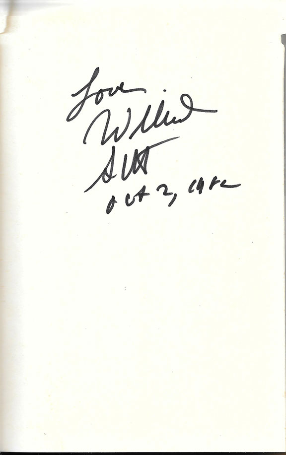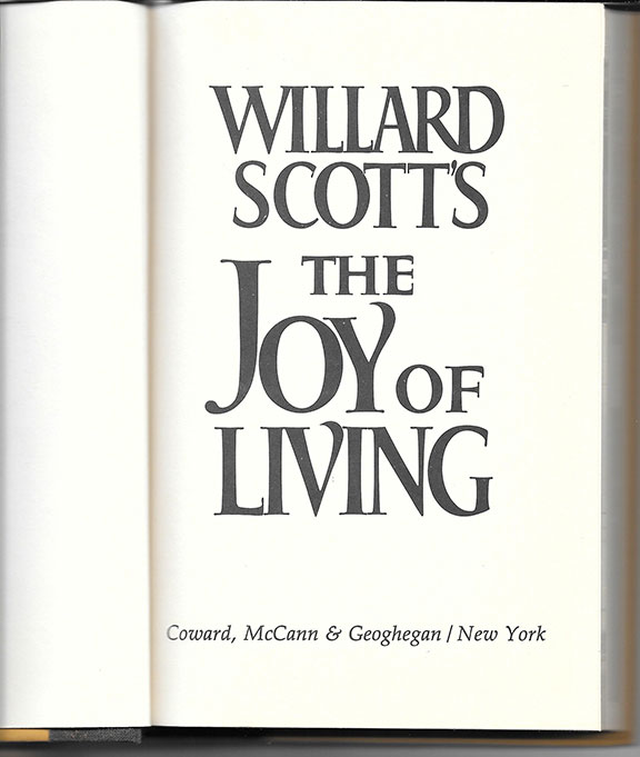 SCOTT, Willard (1934- ) American entertainer who was “Bozo the Clown” (1959-1962). He was invited to The White House by President Kennedy and he entertained Caroline Kennedy during her White House Birthday Party. Scott also played Santa Claus at various White House Christmas events. He created and was the original portrayer of the clown Ronald McDonald ((1963-1971). For years he was the weatherman on the “Today Show.” His first book: “The Joy of Living”, Coward, McCann & Geoghegan, New York, 1982, First Edition. Two hundred twenty-two pages with illustrations. Nice illustration of Scott as “Bozo” and another as “Ronald McDonald”. On the front free end-paper Scott has written: “Love, Willard Scott, Oct. 2, 1982.” In V/G condition. Not a common book to be found signed.................................$65.00