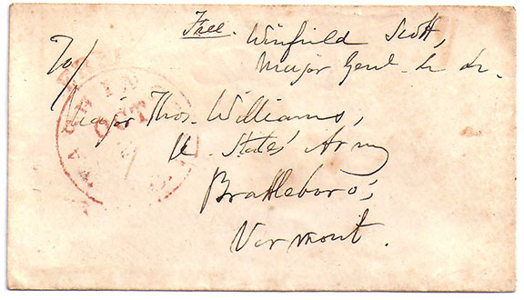 SCOTT, Winfield (1786-1866). Union General, Presidential candidate. Envelope hand addressed by Scott to Major Thos. Williams, U. States Army, Brattleboro, VT. Free Franked by Scott with his desirable full signature adding his rank. Light postmark from Washington......................SOLD |