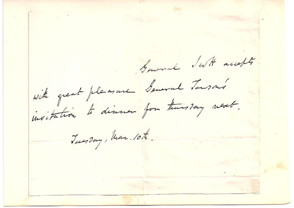 SCOTT, Winfield (1786-1866). Union General, hero of the Mexican War, captured Mexico City. Autograph letter signed, in the third person, one page, on a large slip. Tuesday, Mar. 10th (ny). He writes: “General Scott accepts with great pleasure General Towson’s invitation to dinner for Thursday next.” Mounted to a larger page, otherwise fine and perfect for matting/framing. Not common in the form of handwritten letters.................... $395.00 |