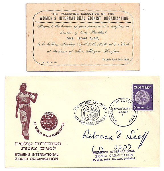 SIEFF, Rebecca (1890-1966). Sister of Sir Simon Marks, the head of Marks & Spencer and founder of the Weizmann Institute. She married Israel Moses Sieff, a British Zionist and collaborator of Weizmann, Secretary of the Zionist Institute at Rehovot (1934). She was the founder and president of the Women’s International Zionist Organization (WIZO). First Day Cover commemorating the 12th WIZO World Conference. Cachet at the left of the cover and affixed to the upper right is an Israeli postage stamp postmarked Jerusalem, Sept. 5, 1951. Choice and rare double signature of Rebecca Sieff in English & Hebrew. Together with an invitation to a reception of WIZO in honor of President Sieff, held April 27, 1924...........SOLD