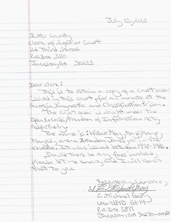 10). Autograph letter signed, one full page, July 12, 2015 to Butts County Clerk of Superior Court, Jackson, Florida. Gary is requesting a copy of a court order available by the Freedom of Information Act for inmate Wilbur May a-k-a- Brandon Jones. Signed twice, once in printed form and the other in script. Full signatures of C. Michael Gary are not common............................................................................$67.50