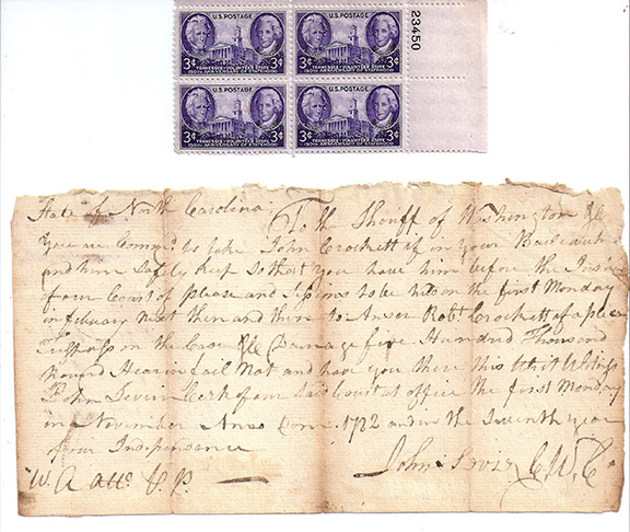 SEVIER, John (1745-1815). Indian fighter, soldier, frontiersman, politician later becoming an outlaw. He was a pioneer in 1773 and during the Revolutionary War he led an expedition over the Smokey Mountains and helped defeat the British at King’s Mountain. Later he led an expedition against the Cherokee Indians. This was one of the first campaigns that brought him fame as an Indian fighter. In 1784, the State of Franklin was organized and Sevier was elected Governor. Indian troubles led to his downfall and the end of the State of Franklin in 1788. His career was blasted and he became an outlaw. Soon after he was pardoned and elected to the North Carolina Senate. In 1796, the lost State of Franklin” became part of the new State of Tennessee. Sevier was elected its first Governor and served a total of six terms. Manuscript document signed, one page, 8”x4”, North Carolina, 1 November 1782. Sevier orders the Sheriff of Washington, No. Carolina to apprehend john Crockett so he can answer a complaint by Robert Crockett concerning damages of 500,000 pounds. Very interesting association of names. Items written and signed by John Sevier are very uncommon and desirable..........................$2,500.00