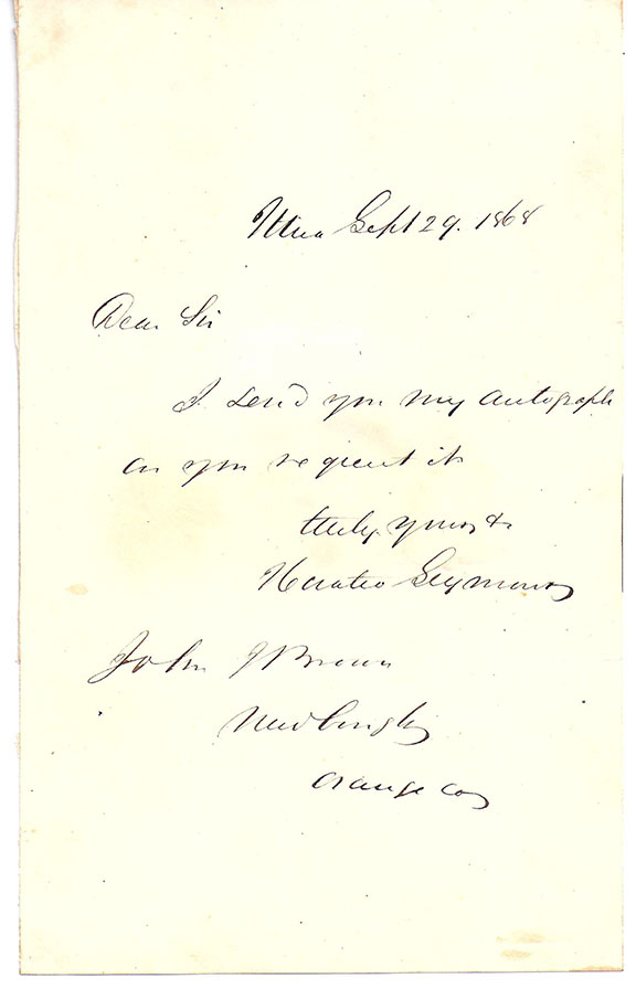 SEYMOUR, Horatio (1810-1886). Civil War Governor of New York. Presidential candidate. Autograph letter signed, one page, Utica, Sept. 29, 1868. To John J. Brown, Jr. A fine letter sending his autograph..................... $65.00 |