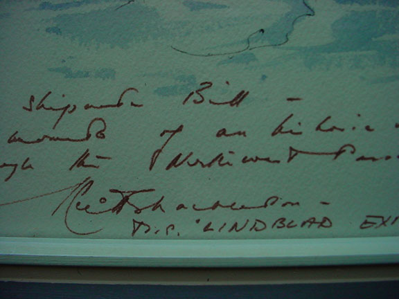 Personally inscribed and signed by Shackleton to one of his shipmates named “Bill” who sailed on an historic voyage of the MS Lindblad. Also dated by Shackleton “September 1984”. In excellent condition, framed................SOLD
