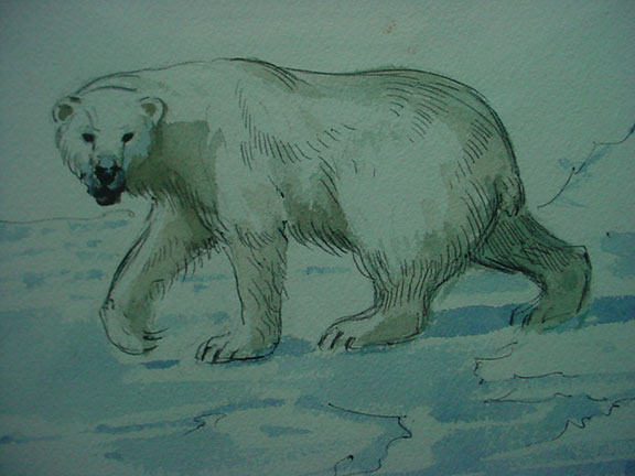 Original watercolor by Keith Shackleton, of a polar bear on ice, measures appx: 8.5”x11”.