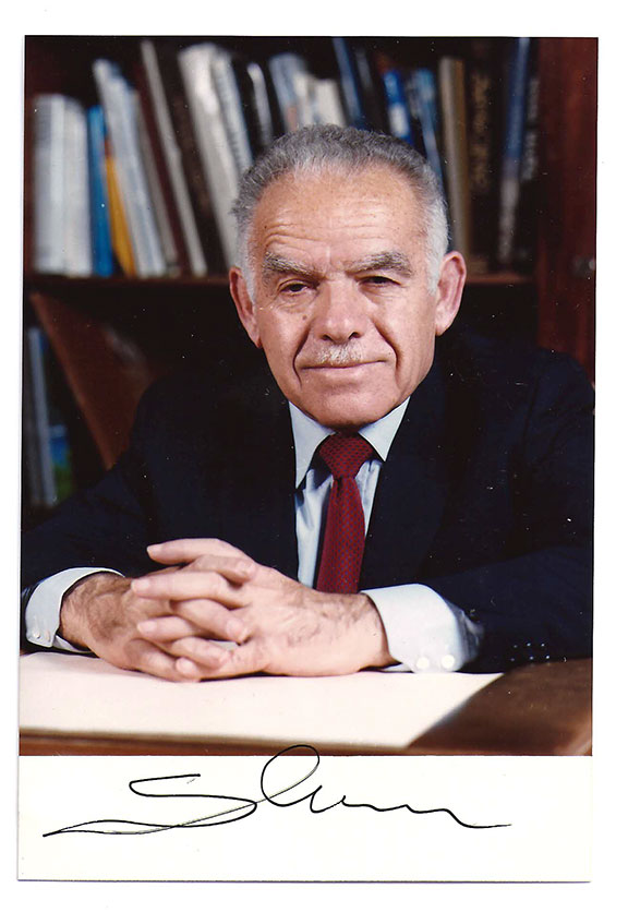 SHAMIR, Yitzhak (1915-2012). Seventh Prime Minister of Israel serving two terms (1983-84) & (1986-92). A Zionist leader, he opposed British control of Palestine. He was imprisoned but escaped. He plotted to assassinate a British Minister but was caught and imprisoned in Africa. He escaped through a 200 foot tunnel. He received a forged passport and returned to Israel after the Israeli Declaration of Independence in 1948. His parents survived the holocaust only to be murdered by anti-Semitic thugs. Photograph, color, 4”x6”, half length pose sitting at his desk. Boldly signed on the lower white margin. Excellent condition...........SOLD
