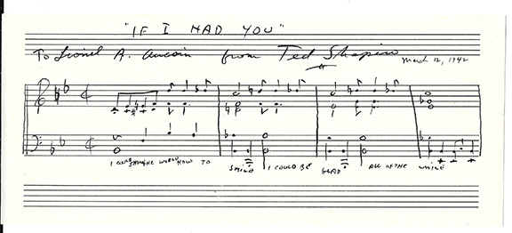 SHAPIRO, Ted (1889-1980). Composer, pianist, songwriter and sheet music publisher. His song “If I Had You” (1928) was a song about a hit record. It became a Jazz and vocal music standard with dozens of recorded versions starting with Frank Sinatra. AMuQs, the composer has written two lines of music along with the lyrics to “If I Had You” on printed music paper measuring appx: 3.75”x9”. He has identified the music. Inscribed, signed and dated “March 1, 1942.” Uncommon .........$125.00![]() |