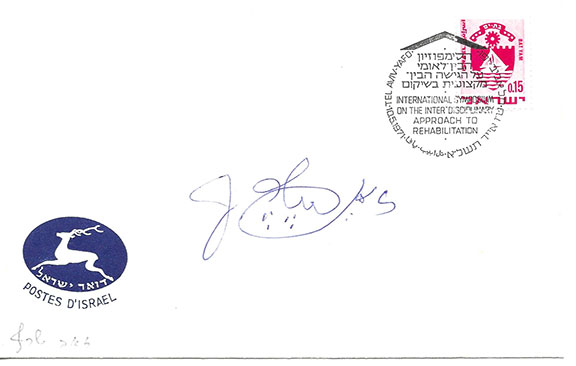 SHAREF, Zeev (1906- ) Israeli politician, more than any other man, he created the structure of Israel’s first government and set the stage for the ceremonies at which the State of Israel officially came to being. Shaerf served as Secretary to the First Israeli Cabinet. It was his duty to pick up the final draft of Israeli’s Declaration of Independence that was typed at the Jewish National Fund building. He stayed in the building until it was finished but realized he did not make any plans for a ride. He was left to flag down a car and asked the driver (who was driving a borrowed car and had no license) to take him to the ceremony. While driving across the city, the car was stopped for speeding by police. A ticket was not issued after it was explained that the officer was delaying the signing of their Declaration of Independence. Sharef arrived at the museum at 15:59 and at 16:00 Ben Gurion opened the ceremony. Ze’ev Sharef is known as Israel’s “Number One Civil Servant.” At the signing of Israels Declaration of Independence, he read out the council members names alphabetically in Hebrew, each member came to the podium to sign the Scroll. Sharef held two posts in the cabinet of Levi Eshkol, Minister of Finance and Minister of Commerce and Industry. In Golda Meir’s cabinet, he held the position of Minister of Housing. He was the First Secretary of Government, a position he held with distinction until 1957. Nice Israel postal cover with a postage stamp commemorating the International Symposium on The Inter Disciplinary Approach To Rehabilitation, Tel-Aviv, 10.5.1971. Signed in Hebrew by Zeev Sharef. An important figure in the founding of the State of Israel. In fine condition. An autograph seldom found...........$125.00