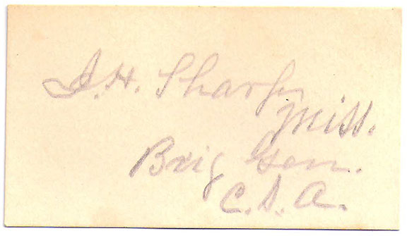 SHARP, Jacob Hunter (1833-1907). Confederate General. A lawyer, he enlisted in the 1st Battalion Mississippi Infantry in 1861. As a Colonel he led the 44th at Chickamauga and Chattanooga. He was promoted to Brigadier General in July 1864. He led his brigade in the Tennessee and Carolina campaigns. After the war he practiced law, purchased a newspaper and served in the Mississippi legislature. Card signed in pencil adding: “Miss. Brig. Gen. C.S.A.”................... SOLD |