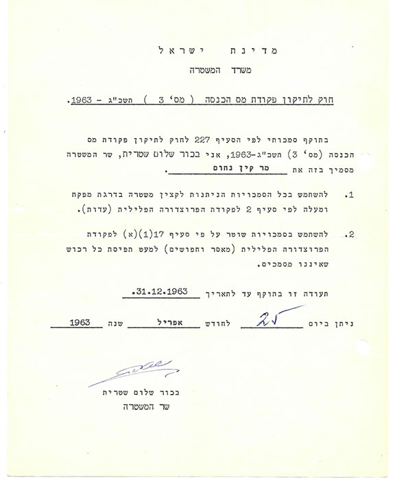 SHEETRIT, Bechor Shalom (1895-1967) Minister of Police (1948-1967), Minister of defense for more than 18 years while serving in 14 different governments. Party printed document signed, one page, Dec. 31, 1963, not translated. Signed in Hebrew. Two file holes otherwise in fine condition........$75.00