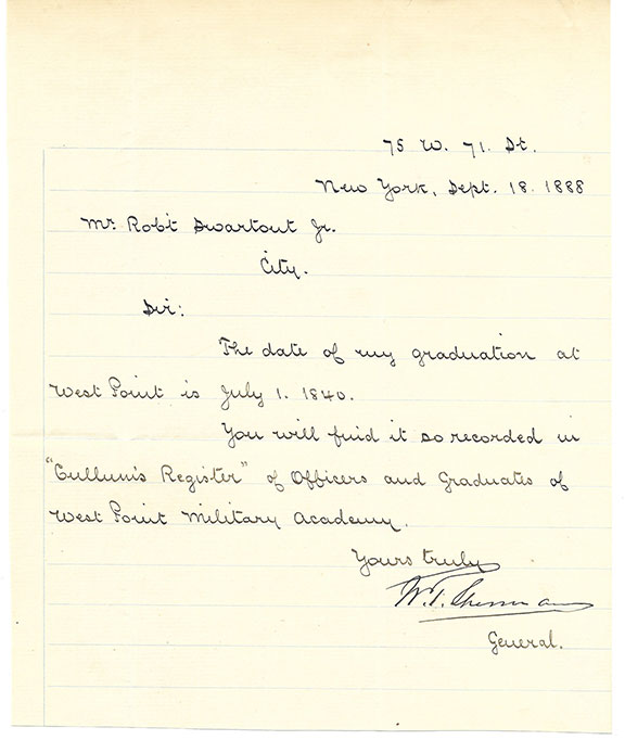 SHERMAN, William Tecumseh (1820-1891). Legendary Union General and Commander-in-Chief of the Armies of the United States; was an American soldier, businessman, writer, and General for the Union forces in the American Civil War, best known for his capture of Atlanta, Georgia, and his March to the Sea (from Atlanta to Savannah, Georgia). Nice informative letter signed, one page, New York September 18, 1888. ‘The date of my graduation at West Point is July 1, 1840. You will find it so recorded in ‘Cullunis Register’ of Officers and graduates of West Point Military Academy.” Boldly .......................$750.00