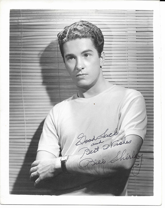 SHIRLEY, Bill (1921-1989). American actor and singer. Best known for speaking and singing voice of Prince Phillip in Walt Disney’s 1959 classic “Sleeping Beauty.” He is known as “The Boy With The Golden Voice.” He played the leading role as Stephen Foster in “Dream of Jeanie.” Uncommon photo, 8”x10”, B&W, half length pose. Signed with a five word sentiment: “Good Luck and Best Wishes Bill Shirley.” In fine condition....................$85.00![]() |