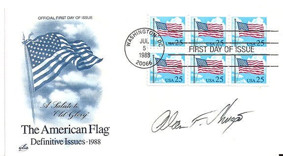 SHUGART, Alan (1930-2006). Inventor of the computer disk drive. His company was the largest independent manufacturer of disk drives. In 1996 he launched an unsuccessful campaign to elect “Ernest” his mountain dog to Congress. He wrote about this experience in a book Ernest Goes To Washington. Full signature on an American Flag First Day cover, canceled Washington, July 5, 1988............ $27.50