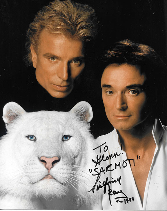 SIEGFRIED and ROY. (1939-2021) & (1944-2020) German/American magicians known for their appearances with white lions and tigers. Roy's career ended in 2003 due to an injury from a tiger. Their show in Las Vegas is said to be the most visited. Color photograph, 8”x10” from the Mirage in Las Vegas. Siegfried and Roy are posing with Sitarra, one of their Royal White Tigers. Boldly inscribed and signed "To Glenn! Sarmoti, Siegfried/Roy 1999". In excellent condition...........$67.50 |