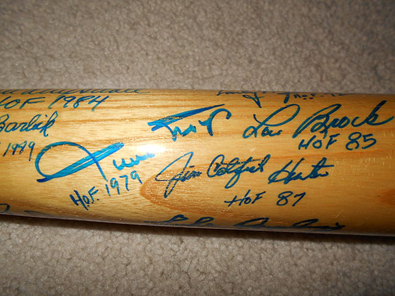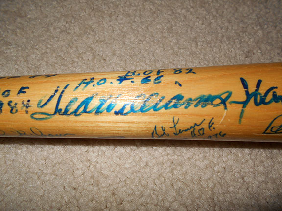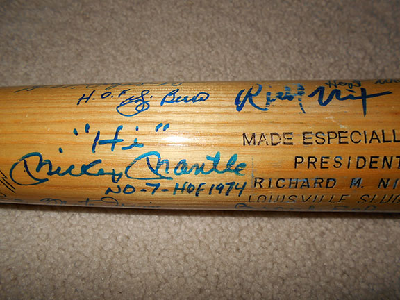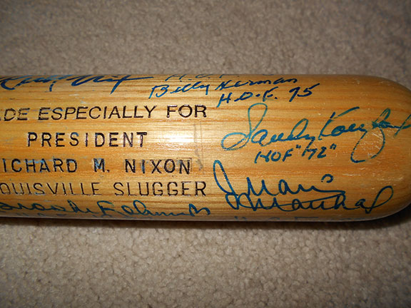 The following have signed the bat. Enos Slaughter, Louis Aparicio, Buck Leonard, Ernie Banks, Whitey Ford, Rick Ferrell, Bob Gibson, Billy Williams, Willie McCovey, Harmon Killebrew, Ted Williams, Bob Lemon, Ralph Kiner, Bob Feller, Frank Robinson, Red Schoendienst, Yogi Berra, Hank Aaron, Eddie Matthews, Ray Dandridge, Jocko Conlon, Willie Stargell, Don Drysdale, Al Barlick, Willie Mays, Early Wynn, Jim Catfish Hunter, Luke Appling, Bobby Doerr, Lefty Gomez, Mickey Mantle, Monte Irvin, Early Wynn, Lou Brock, Johnny Mize, Lou Boudreau, George Kell, Hoyt Wilhelm, Billy Herman, Robin Roberts, Stan Musial, Duke Snider, Warren Spahn, Juan Marichal, Al Kaline and Sandy Koufax. In addition this bat is expressly made for President Richard Nixon and has been hand signed by Richard Nixon. There is some rubbing to four signatures. All signers have added “HOF” and the year they were inducted into the Hall of Fame. One of a kind..........................SOLD