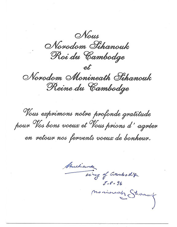 SIHANOUK, Monineath (1936- ) Queen of Cambodia, imprisoned by the Khmer Rouge from 1976-1979. She is the sixth wife of King Norodom Sihanouk. Printed card 5”x7”, from the King and Queen sending greetings. Signed by Norodom Sihanouk “N. Sihanouk, King of Cambodia 5-8-96.” The Queen has also signed this card as “Monineath Sihanouk.” A fabulous example of signatures of the King and Queen on the same item. Quite scarce...........................$225.00 ![]() |