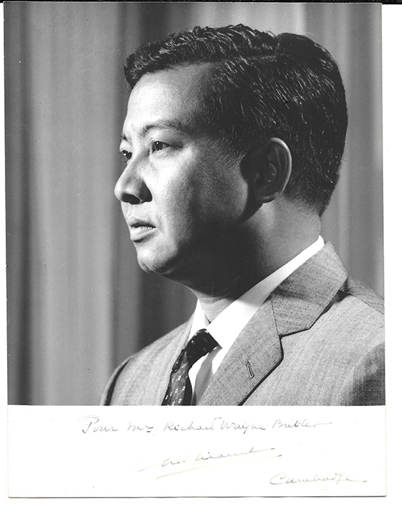 SIHANOUK, His Royal Highness Prince Narodom (1922-2012). King of Cambodia (1941-1955). Deposed provisional Head of State of Cambodia (1993- ) Photograph, 7”x9”, B&W, head and shoulders pose facing to one side. Inscribed and signed on the lower white margin. Circa 1969. Uncommon in signed photographs........................ $250.00