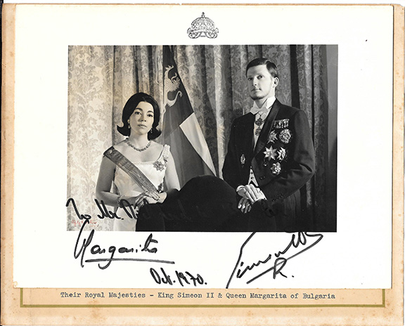 QUEEN MARGARITA (1935- ) She is also known as Tsaritsa Margarita. Rare official photograph of the Royal couple in formal dress. Measures overall 7”x9”, B&W, Signed “Simeon II R” and inscribed signed and dated “Oct. 1970” by Margarita. In fine condition........................ $185.00