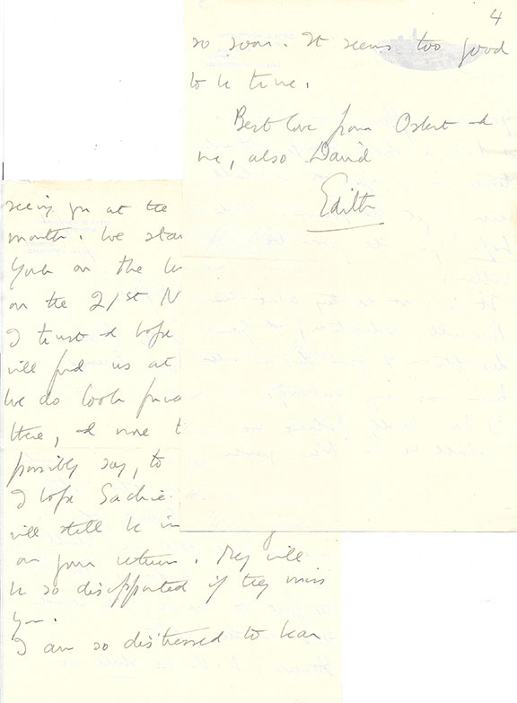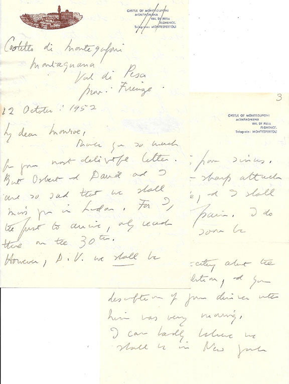 SITWELL, Dame Edith (1887-1964). English poet, novelist. Autograph letter signed, three and one half pages, signed “Edith.” Stationery of Castle of Montegufoni, Florence, 12 Oct. 1952 to her friend Monroe Wheeler, the noted author and Director of Exhibitions of the Metropolitan Museum of Art in New York. She writes in part: “...we started for N.Y. on the United States, on the 21st of Nov. so I trust and hope the 26th will find us at the St. Regis... I am so distressed to hear you are suffering from sinus. I had a short, sharp attack twice in my life, and I shall never forget the pain....it is most exciting about the Rouault Exhibition ....I can hardly believe we shall be in New York so soon. It seems too good to be true. Best Love from Osbert & me...” A fine example of a lengthy letter.