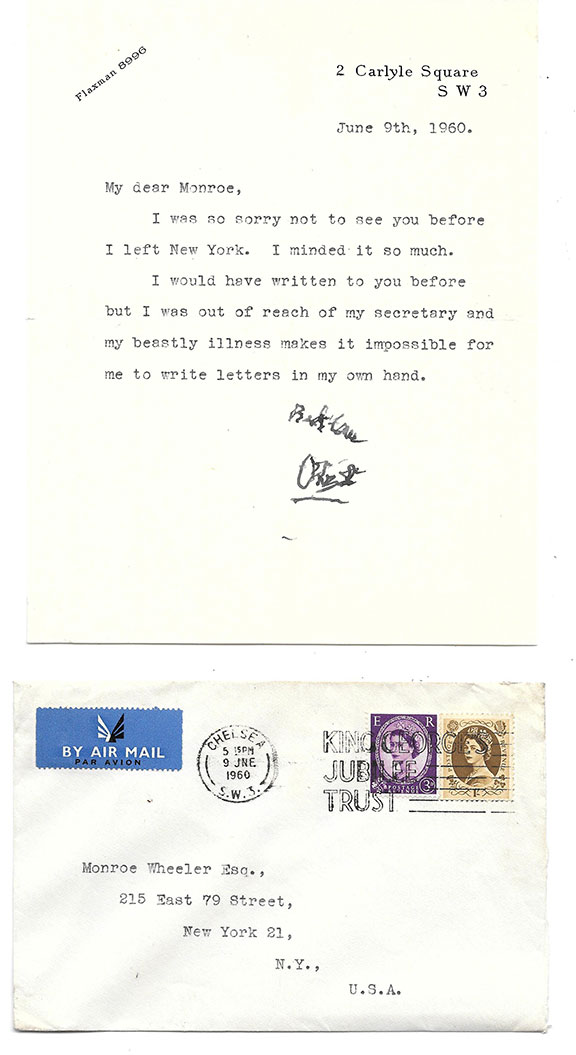 SITWELL, Sir Osbert (1892-1969). English poet, playwright and novelist. Typed letter signed, one page, June 9, 1960. To Monroe Wheeler. In part: ‘I was so sorry not to see you before I left New York. I minded it so much. I would have written to you before but I was out of reach of my secretary and my beastly illness makes it impossible for me to write letters in my own hand.” By his hand he adds “Best wishes Osbert.” Together with his original mailing envelope. The collection...............................$350.00