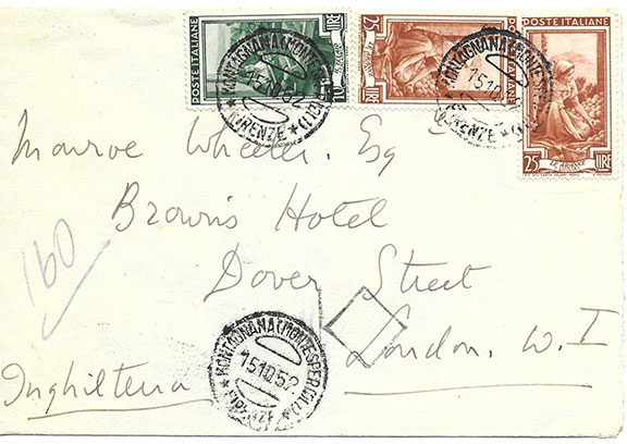 SITWELL, Dame Edith (1887-1964). English poet, novelist. Envelope addressed to her friend Monroe Wheeler at the Brown’s Hoel Dover Street , London. Three Italian postage stamps cancelled Firenze 15/10//52. On the verso she has signed her name as “Miss Edith Sitwell” and added a six line return address. Monroe Wheeler was the noted author and Director of Exhibitions of the Metropolitan Museum of Art in New York. In fine condition...........................$87.50![]() ![]() |