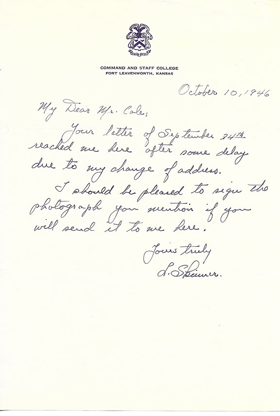 Rare autograph letter signed, one page on the letterhead of Command and Staff College, Ft. Leavenworth, Kansas, October 10, 1946.