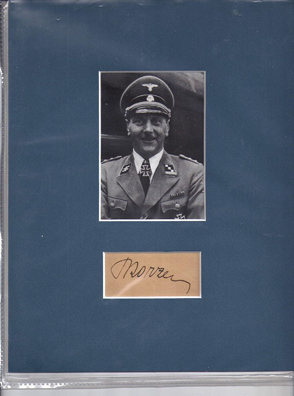 SKORZENY, Otto (1908-1975). World War II commando. Noted for rescuing Mussolini from Gran Sasso, a remote mountain top in Italy. During the “Battle of the Bulge” Skorzeny and his men were dressed like American soldiers and painted their tanks with American insignia’s. Called “Operation Grief” Skorzeny was called “The Most Dangerous Man in Europe.” After the war, he headed an organization named “Die Spinne” (the Spider) which helped hundreds of former SS officers flee Germany. Skorzeny was tried at Nuremberg. Choice signature (said to have been obtained during the Nuremberg trails) matted with a portrait of Skorzeny taken on the day he received the Knight’s Cross. Fine condition ............ SOLD
