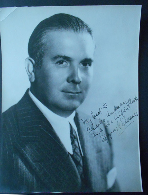 SKOURAS, Spyros P. (1893-1971) Greek-born U.S. Film Entrepreneur. He merged Fox with 20th Century Pictures and served as President from 1942 to 1962. He signed the young model Norma baker to 20th century Fox after changing her name to Marilyn Monroe. She rose to fame as the most famous Hollywood sex symbol of the 20th century. Oversized photograph, 10”x13”, B&W, head & shoulders pose, smiling. Inscribed and signed: “My best to Charles Anderson and the Alpine Theatre, Spyros P. Skouras.” In very good condition except for one bend top left corner..........$225.00