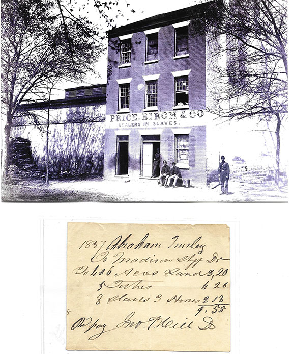Madison County, Virginia. Tax receipt, 1837, for land and 8 slaves and 3 homes totaling nine dollars and 58 cents. Measures 3”x4” and in fine condition. Together with a portrait of a building, Price, Birch & CO, Dealers in Slaves. Three soldiers are outside..................$275.00