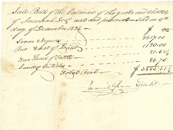 Signed estate Bill of Sale, 4 day of December 1825. Measures 6”x8”. Sale Bill of the balance of the goods and chattel of Joremiah  Dec, real and personal-sold on 4th day of December 1825.  Seven Negroes-$2617.00...One tract of Land...1120.00... Two head of Cattle   21.56.25....and Sundry Articles...84.75. Total Amt----$3843.31.25 Signed Joremiah Glenn Executor.  In fine condition................$550.00