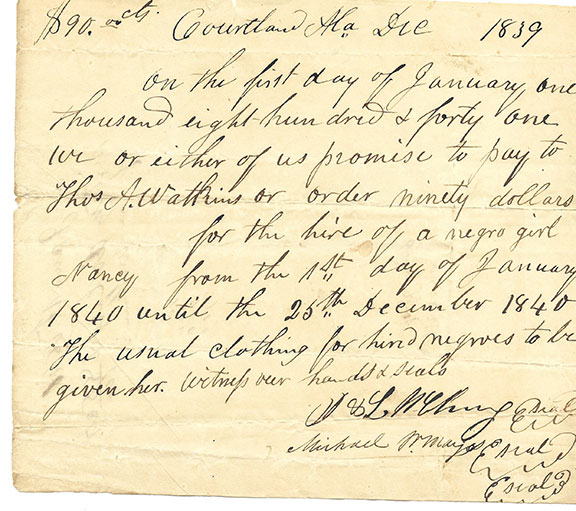 Autograph document signed, one page, Courtland, Ala. Dec.1839. “On the first day of January one thousand eight hundred & forty one we or either of us promise to pay Thos A. Watkins or order ninety dollars for the hire of a negro girl Nancy from the 1st day of January 1840 until the 25th December 1840. The usual clothing for hired negroes to be given her. Witness our hands and seals J.&L McChung, Michael W. Mayes.” In fine condition................$375.00