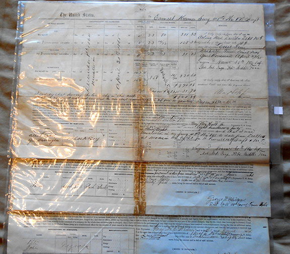 2) Document measures 11”x17”, The United States to 2nd Lieut George A Miller 13TH Cav Tenn Vols. Post at Nashville. 30 day of June 1864 Special Order by Major General Rousseau July 28, 1864. Payment $110 dollars and 95 cents for John, Complexion Black, 5’6” Eyes Black and Hair Black. Signed twice by George A,. Miller 13 Cav, Tenn Vols..