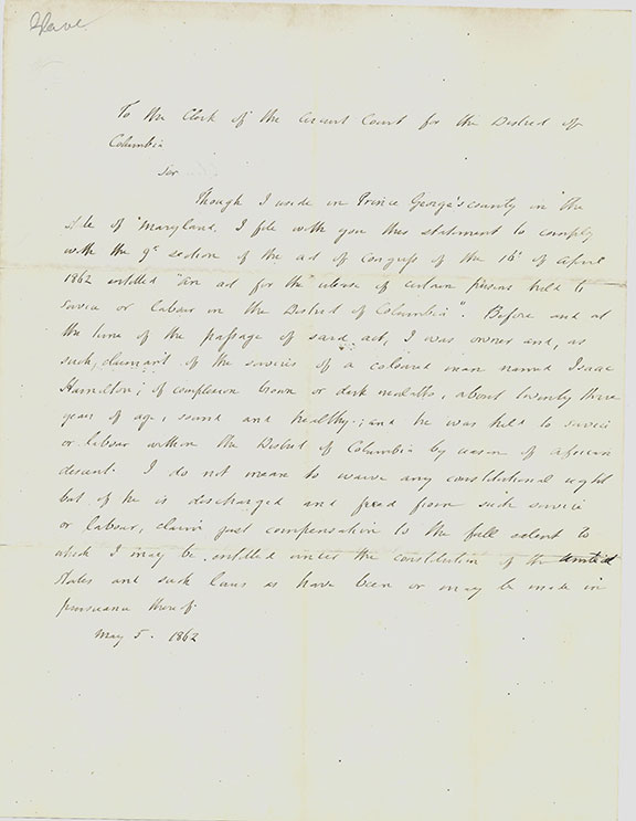 Letter to a Court in D.C. relating to Slave ownership in Maryland