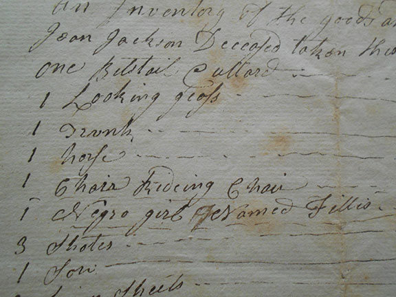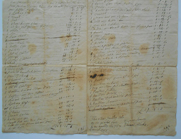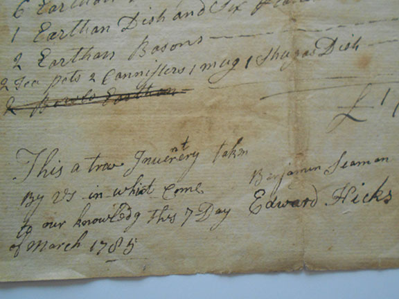 Very lengthy autograph document signed 7th day of March 1785, measures 12”x16”, watermarked on each sheet “Pro Patria” one page one, “GR” (King George III) on page two of the two conjoined sheets. This attractive document is “An inventory of the goods and chattles of the widow Jean Jackson deceased taken this seventh day of March 1785.” Listed are 134 items and values including the highest single value: “1 Negro girl named Fillis 35 pounds.” The list includes chairs, sheets, blankets, feather bed, looking glass, table cloths, frames, basins, pots, plates, knives, forks, silver tablespoons, bushels of corn, earthen ware, etc.” “This a true Inventory taken by us in whist come to our knowledge this 7th Day of March 1785.” Signed by Benjamin Seaman and Edward Hicks. Two ink blots otherwise in very good condition .........$950.00