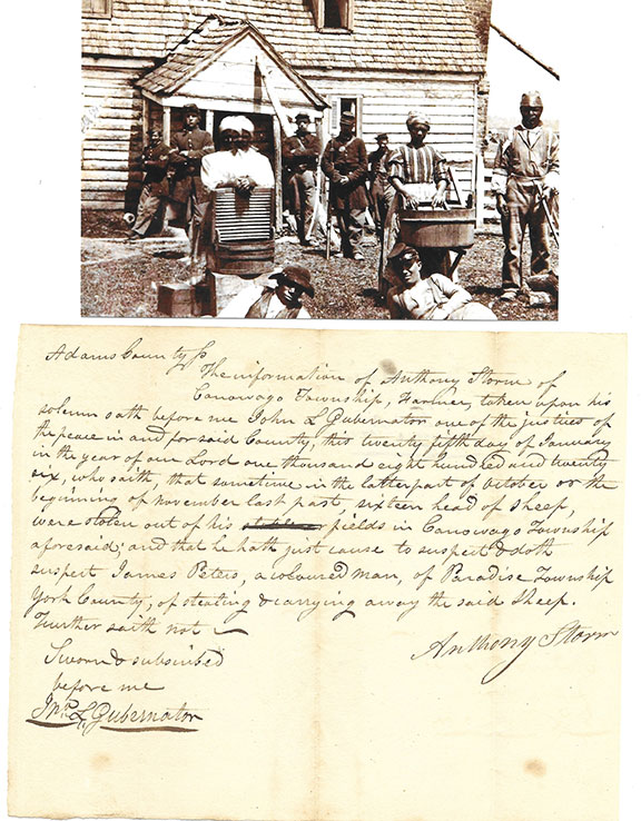 Autograph document signed one page, measuring 5.5”x7.5” Adams County (Pa). The information of Anthony Storm of Canowago Township, Farmer taken upon his solemn oath before me John L. Gubernaton one of the justices of the peace and foresaid county, this twenty fifth day of January in the year of our Lord one thousand eight hundred and twenty six, who saith, that sometime in the latter part of October or the beginning of November last past, sixteen head of sheep were stolen out of his fields in Canowago Township aforesaid; and that he hath just cause to suspect & doth James Peters, a coloured man, of Paradise Township York County, of stealing and carrying away the said sheep. Further saith not---- sworn & subscribed before me JNA L. Gubernaton. Anthony Storm has also signed this document. Writing nice and dark and in near fine condition..................$650.00