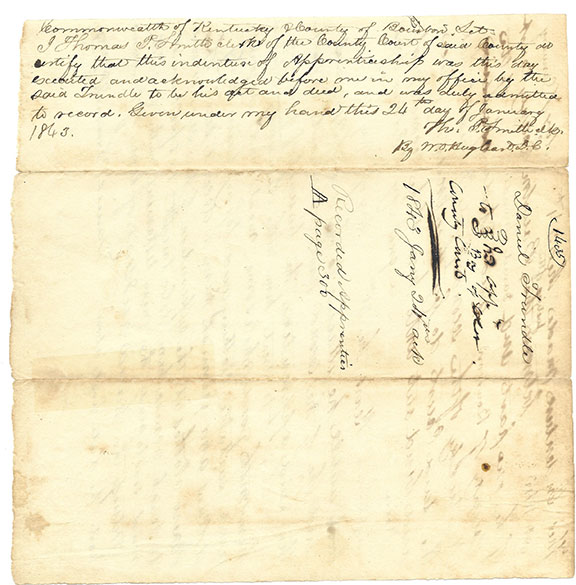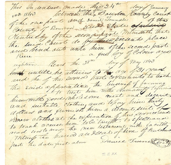 Autograph document signed, one page, measures 7.25x7.75. “This indenture made this 2th day of January A,D between Justice of the Bourbon County court of the one part and Daniel Trundle of the Count of Bourbon and State Kentucky of the second part witnesseth that the said court do by these presents place and bind out unto him of the second part Reese a free boy of colour aged eighteen years the 30th day of May 1843 until he attains to the age of 21 years and he of the second part covenants to teach the said apprentice the business of farming-to treat him with humanity to furnish him with good wholesome meat and decent and suitable clothing and to pay him thirty dollars and furnish him a decent suit of new clothes at the expiration of his service and to teach or cause him to be taught to spell and read so as to read the New Testament with facility virtues the hand and seal of him of the second part the date first above (signed by) Daniel Trundle seal. On the verso are several lines written and signed by Thomas P. smith clerk of the county court attesting to this apprenticeship and that this Indenture was duly admitted to record 24th day of January 1843. This document in V/G to near Fine condition..................$850.00