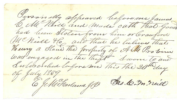 Autograph document signed, one page, 4”X8”, 20th day of July 1859. “Personally appeared before me James C. McNeill and made oath that goods had been stolen from him of Crawford McNeill & Co. and that Henry a Slave the property of A.M. Probine was engaged in the theft. Sworn to and subscribed before me this the 20th day of July 1859 E.J. McFarland JP.” Also signed by Jas. C. McNeill. In fine condition..................$475.00