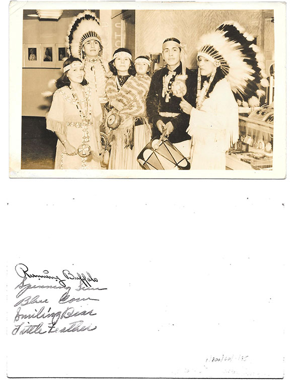 Chief Smiling Bear. American Indian Chief. Postcard photograph of the Chief with his entire family all in full dress. Signed on the verso in ink by Running Buffalo, Spinning Sun, Blue Corn, Smiling Bear and Little feather. A most unusual combination of signatures................