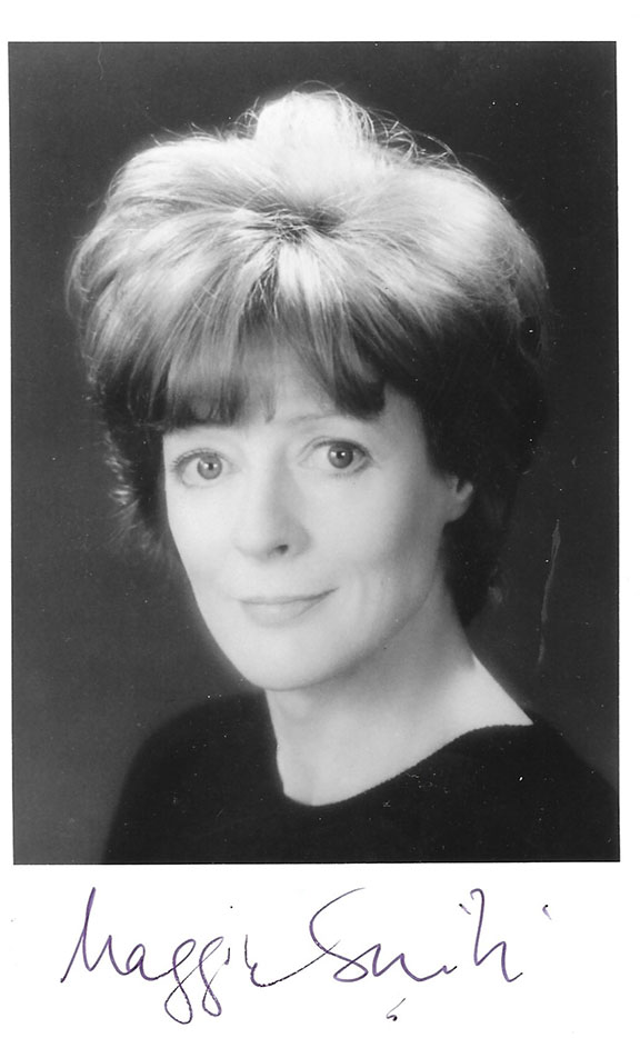 SMITH, Maggie (1939-2024) British actress known for her wit in both comedic and dramatic roles. Received two Academy Awards. From 2001-2011 she played Professor Minerva McDonagall in the Harry Potter film series. Photograph, B&W, 3.5”xX5.5”, head and shoulders pose bearing a faint smile. Beautiful signature on the lower white portion. Collectors notes on verso state this photo was received in Dec. 1987. In V/F condition...........................$95.00![]() |