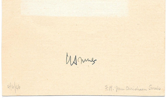 SMUTS, Jan Christian  (1870-1950).  So. African Statesman. British General in WWI. Appointed Field Marshall by King George VI. Smuts helped create the Royal Air Force. Prime Minister of the Union of South Africa (1919-1924) and again (1939-1948). He was a supporter of racial segregation.  Signature of a large card. Dated “4/6/46” by a former collector..