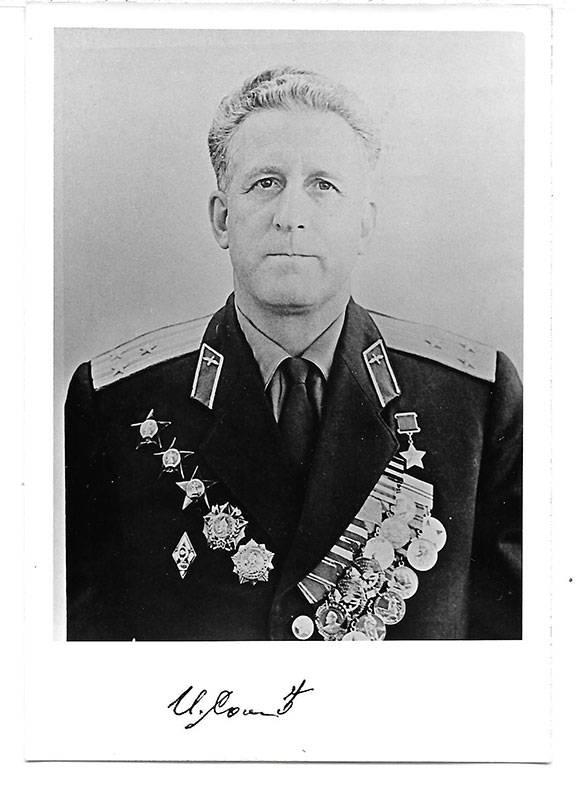 SOMOV, Ivan (1921- ) Fighter pilot, U.S.S.R. Flew 399 sorties. Ace credited with 28 victories. Hero of the U.S.S.R. 91944). Recipient of the Lenin Order, 2X order of the Red Standart, 3X Order of the Red Star, Order of the Bordan, Order of the Patriotic War and Order of A. Nevsky. Photograph, B&W, 3.5”X5”, head & shoulders pose in uniform wearing a chest full of medals. Signed on the lower white mount. In fine condition...............SOLD![]() |