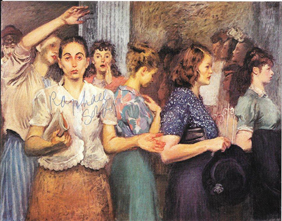 SOYER, Raphael (1899-1987). Russian born American painter. He was devoted to painting people in their everyday vibrant lives. Color print, appx. 7”x9.5” of ten women in a crowd, possibly at an art gallery. Signed in full by Raphael Soyer across the chest of one of the women. A fine example, very attractive and colorful. A nice item for framing......$85.00