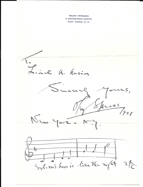 SPEAKS, Oley (1874-1948). Composer and songwriter, baritone singer in churches. Of his 200 songs he may be best known for “Sylvia” and “The Road to Mandaly.” “Sylvia” (1914) was a million selling success. Robert Merrill and John McCormick also recorded “Sylvia”. Speaks was Director of ASCAP from 1924 to 1943. AMuQs, the composer has written two bars of music and the words to “Sylvia” on his name imprinted letterhead. Inscribed, signed and dated “1938). Quite uncommon and desirable ........................................$125.00