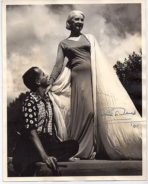 ST. DENIS, Ruth (1878-1980). A dancer who appeared in vaudeville and made a few early films. Married to Ted Shawn. She is known as “The First Lady of American Dance“. Vintage photograph, 8”x10”, B&W, full length posing in a gown with her hand on the shoulders of a man. Boldly signed and dated “51” in her hand. An attractive photograph and not common in this form............... $225.00