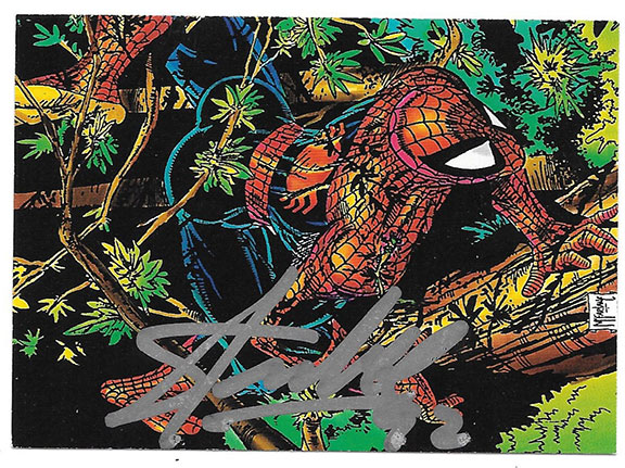 LEE, Stan (1922-2018). American comic book writer who introduced such super heroes as Spiderman, X Man and The Hulk. The McFarland Era Spiderman card #44 titled “Perceptions” 1992, Marvel Entertainment Group Inc. Spiderman is sent to a conflict of loggers and environmentalists where a reporter was supposed to cover the protection of thousand year old trees. A very colorful card depicting Spiderman climbing a tree, bold signed and dated using a silver Sharpie pen “Stan Lee. 92.” Very fine to near Mint condition.............................SOLD